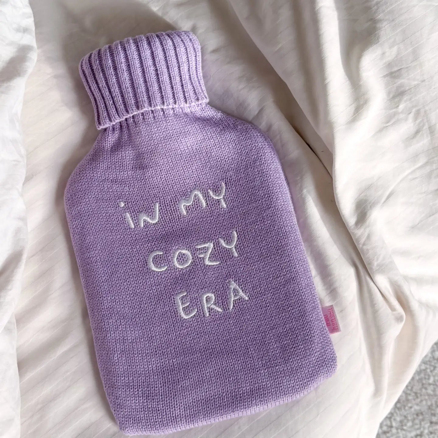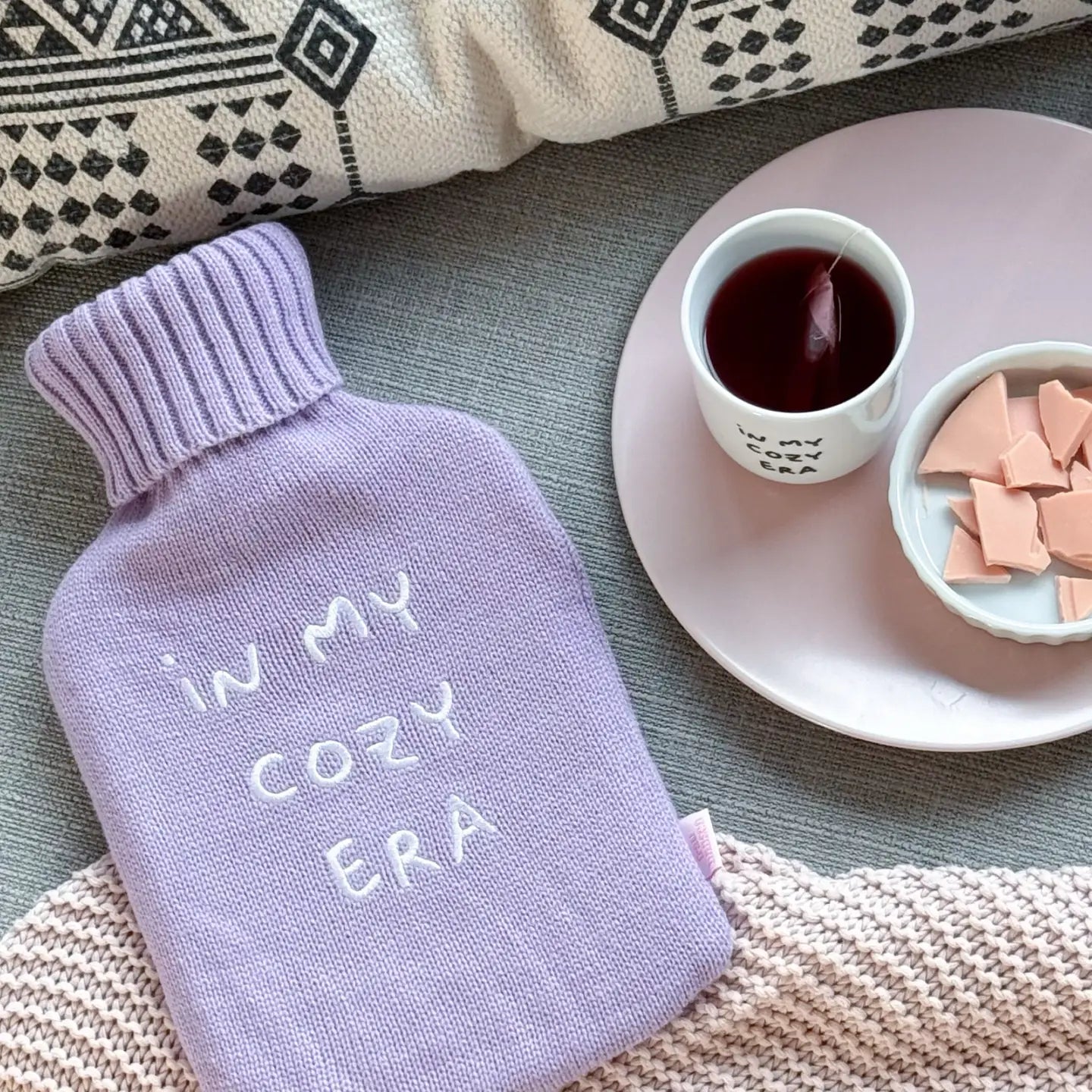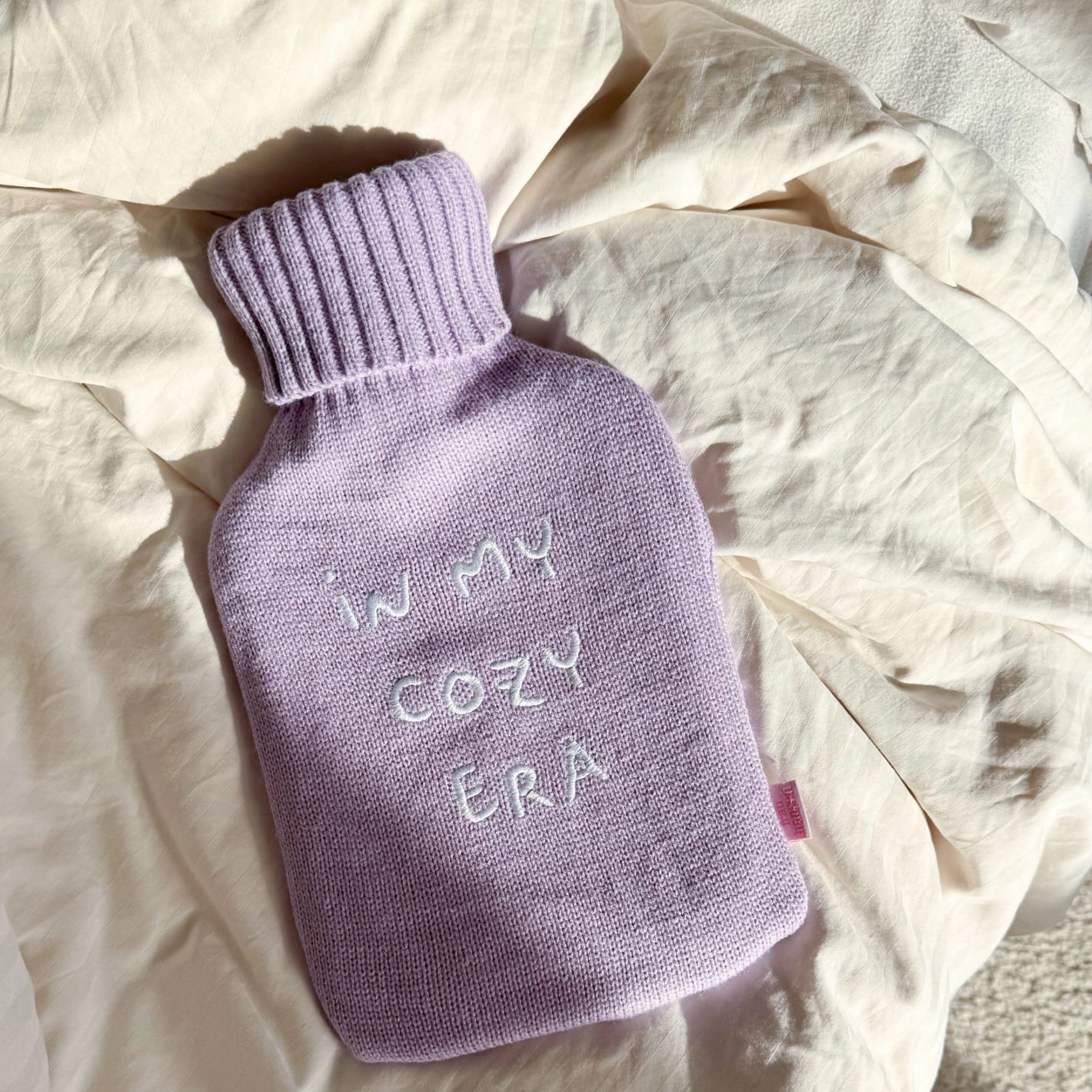 Niedliche fliederfarbene Wärmflasche mit Stickerei mit dem Schriftzug „In my cozy Era“ auf Englisch. Kuschelmodus an! Perfekt für kalte Tage. Unsere Wärmflaschen bestehen aus Naturkautschuk. Das Material hat von Natur aus einen typischen Eigengeruch, der nach kurzer Zeit verfliegt.