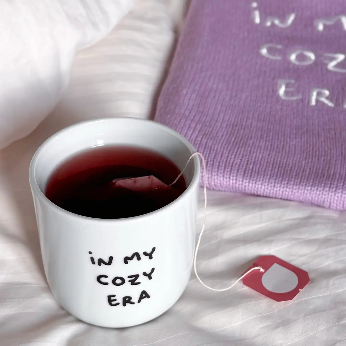 - Bestickte Worte „In my Cozy Era“ auf Englisch