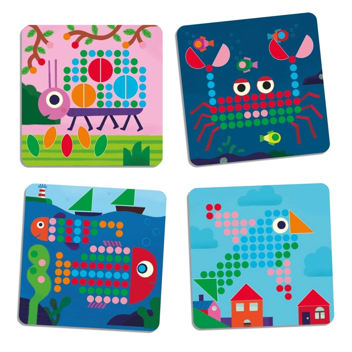 Ein Mosaikspiel, bei dem schöne Bilder entstehen, indem die 8 Zeichnungen mit den bunten Steckern vervollständigt werden. Farben lernen zuzuordnen, Feinmotorik verbessern und bunte Bilder gestalten.