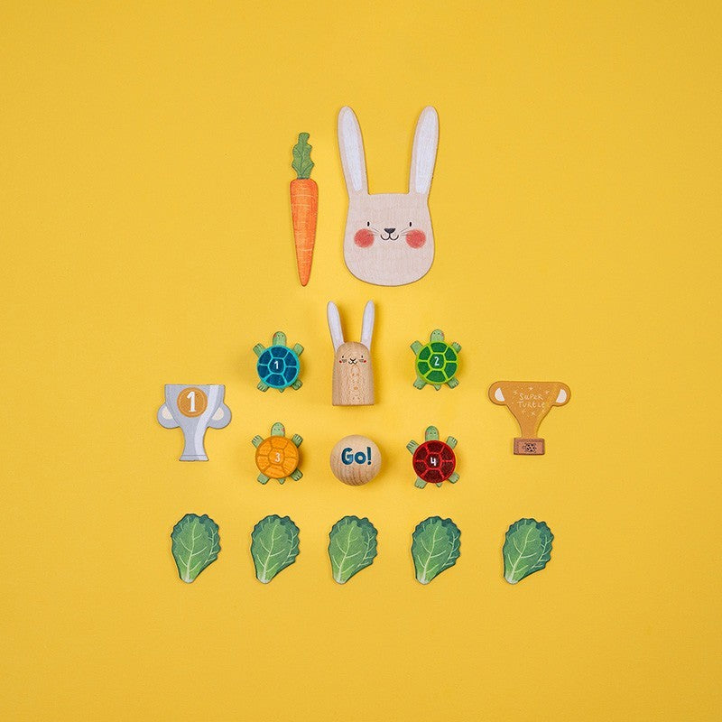 Ein sehr unterhaltsames kooperatives Spiel, inspiriert von der Fabel vom Hasen und der Schildkröte, ab 5 Jahren. Nachhaltiges Spiel aus Karton und Holz. Hergestellt in Barcelona.