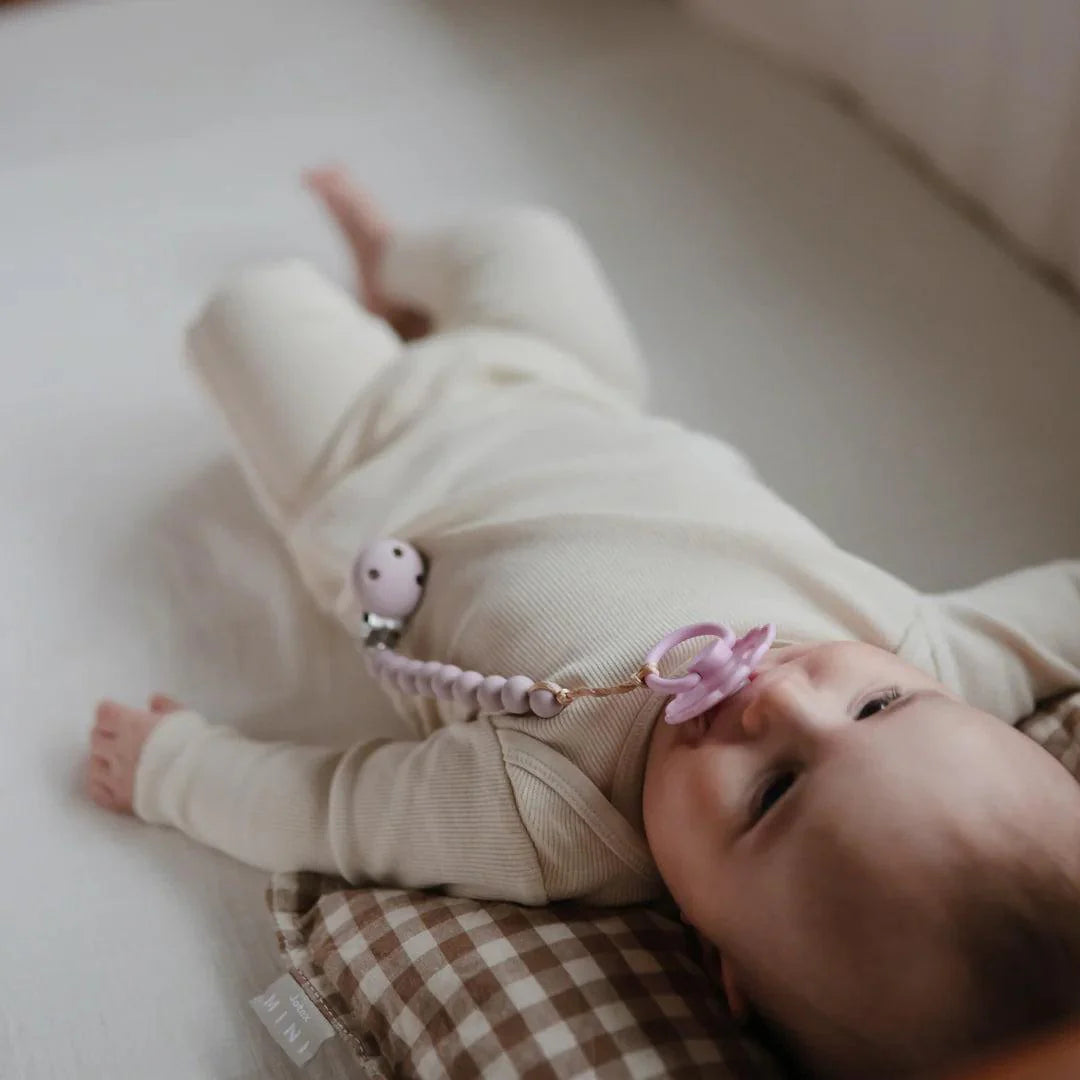 Silikon-Schnullerclip, der Familien unterwegs Haltbarkeit, Funktion und Einfachheit bietet. Hergestellt aus 100 % lebensmittelechtem Silikon, verfügt unser Clip über eine Silikonklammer, die eine moderne Interpretation eines traditionellen Klassikers darstellt. Mit einer einfarbigen Anordnung von Silikonperlen bietet der Hera-Clip Familien ein schönes Accessoire im minimalistischen Design. Der Clip ist leicht zu reinigen und hilft, Beruhigungsgegenstände für die Kleinen griffbereit zu halten.