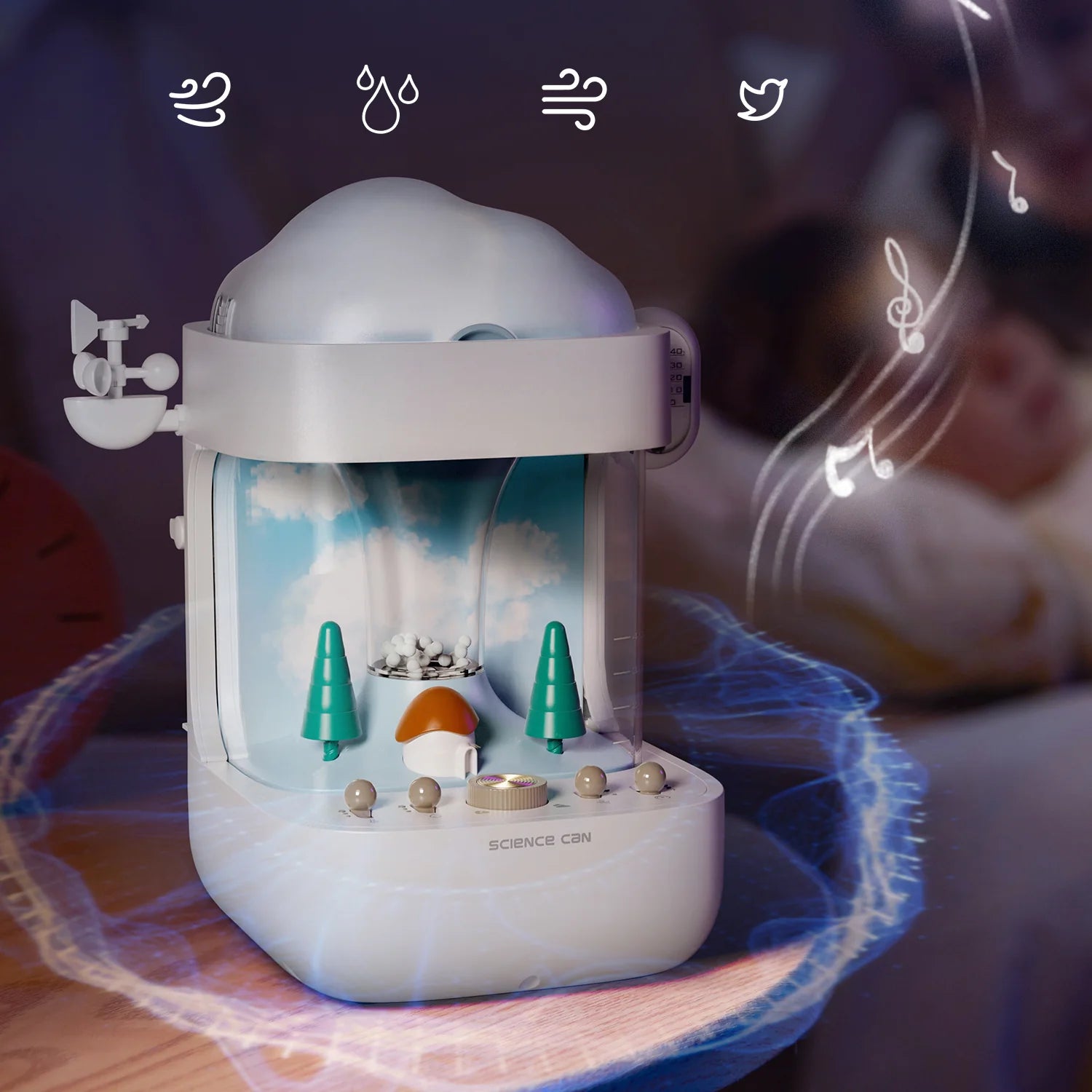 Lernen trifft Entspannung: Verstellbare Einstellungen für Temperatur, Luftdruck, Luftfeuchtigkeit und Luftstrom lassen Kinder frei experimentieren, während vier Weißrauschklänge Fokus, Ruhe und erholsamen Schlaf fördern.
