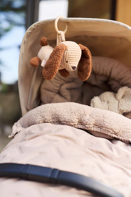 Pram Chain Diego Dog This adorable pram chain Diego Dog is made of soft ribbed fabric in Biscuit color, featuring playful bouclé details in Leather Brown. The plastic ring makes it easy to attach to the pram. With its embroidered eyes and fabric nose, it's the perfect companion for your little one on the go!