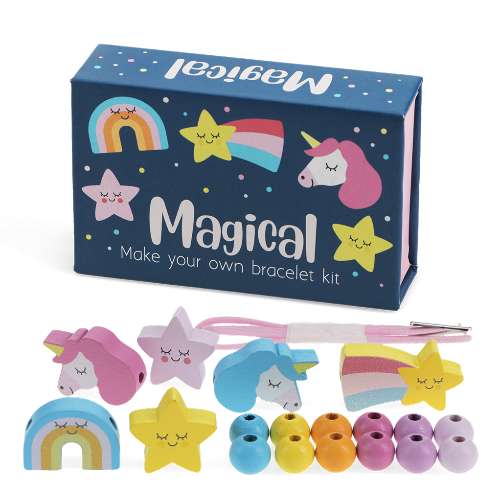 - Enthält: 28 cm langer elastischer Faden mit Metallenden, damit Kinder die Holzperlen leicht auffädeln können, 6 magisch thematisierte Schmuckperlen, darunter Einhörner, Sterne und ein Regenbogen, 12 Abstandshalter-Perlen in sechs Farben (Gelb, Orange, Blau, Flieder und zwei Rosatöne)