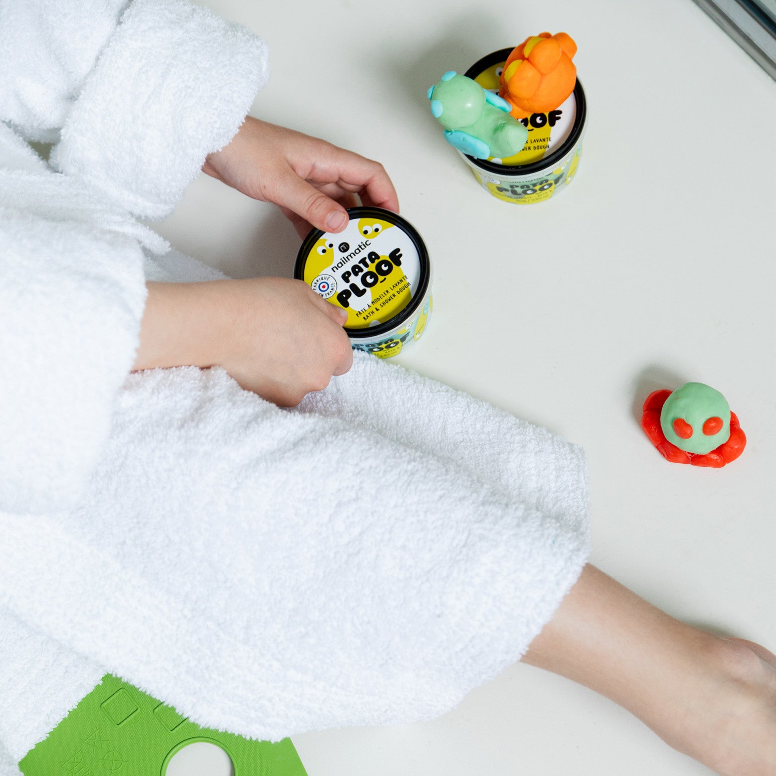 Set inclues two Pots of Bath & Shower Dough: Two vibrant colors to stimulate children's creativity. Pataploof's green and red bath & shower dough is soft and malleable, perfect for creating fun shapes before washing.