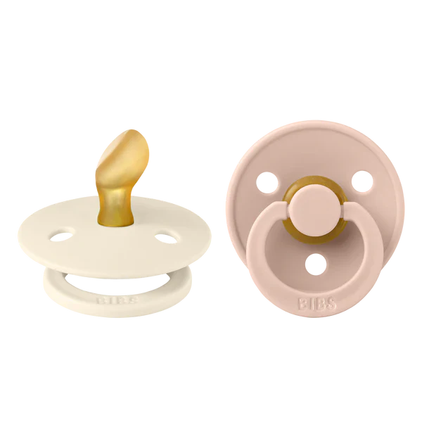 Ivory / Blush coloured pacifier set by Danish brand Bibs with anatomical tip, comes in a 2-pack made of pure, natural rubber. The pacifier is designed to mimic the mother's breast in a natural way, so that your baby can follow their sucking instinct. The pacifiers are classically designed and timelessly elegant. Available in other colours.