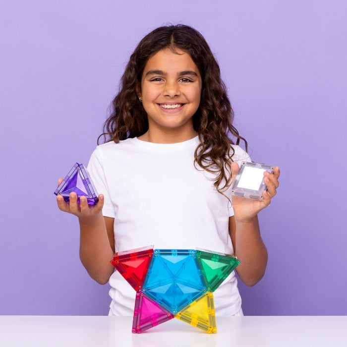 This set includes pentagons, squares and equilateral triangles in all eight bright colors - as well as a rechargeable, glowing magnetic building block that turns building into a fascinating light spectacle!