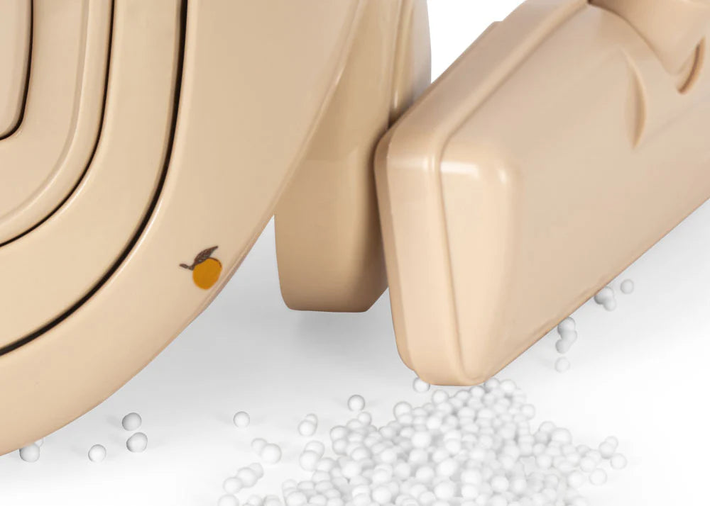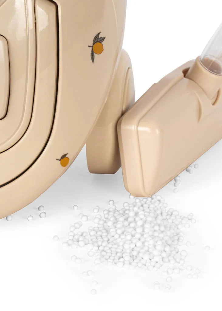 Lemon-print toy vacuum cleaner from Konges Slojd. This electronic, cordless toy vacuum cleaner lets kids help mom and dad with housework. Put the accompanying white balls on the ground and watch the vacuum cleaner suck them up. It helps develop children's imagination and role-play skills.