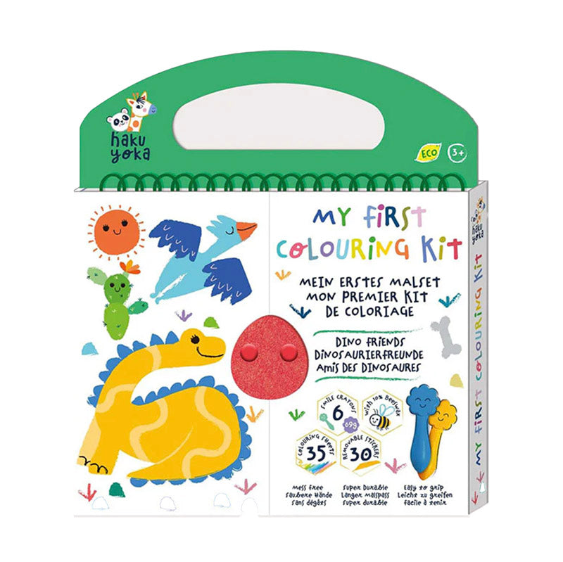 First wax crayon set from Haku Yoka. With this set your child can create cool dinosaur motifs with creative imagination. The colouring set consists of 6 colourful wax crayons, 30 reusable stickers and a dinosaur colouring book with ring binding and Velcro fastening. The book has small compartments for storage for the chalks and is ideal for travel and on the go with a carry handle.
