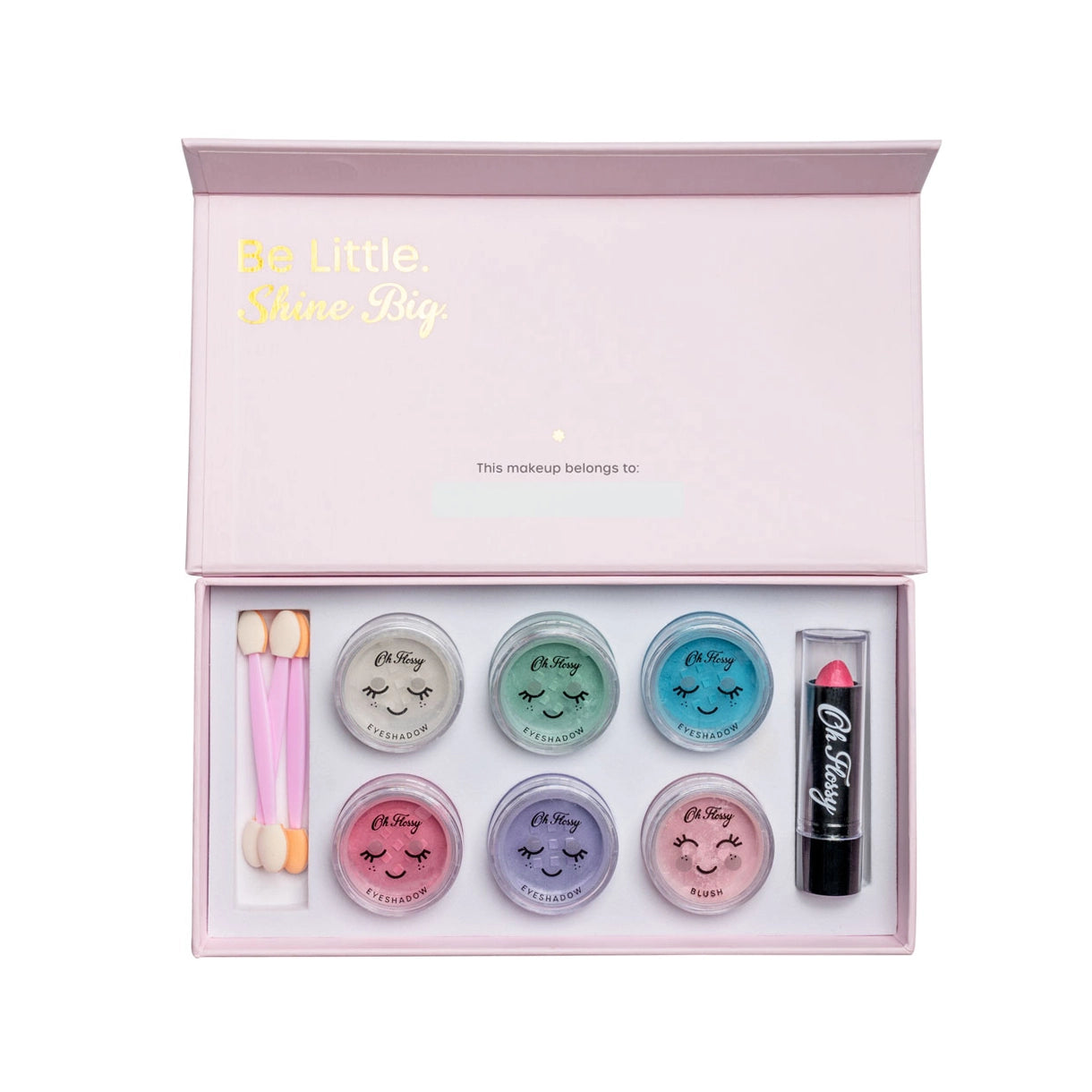 A gorgeous deluxe makeup set for kids with 5 eyeshadows, 1 blush, 1 lipstick and 3 applicators. The set is delivered in a luxurious magnetic closing box.