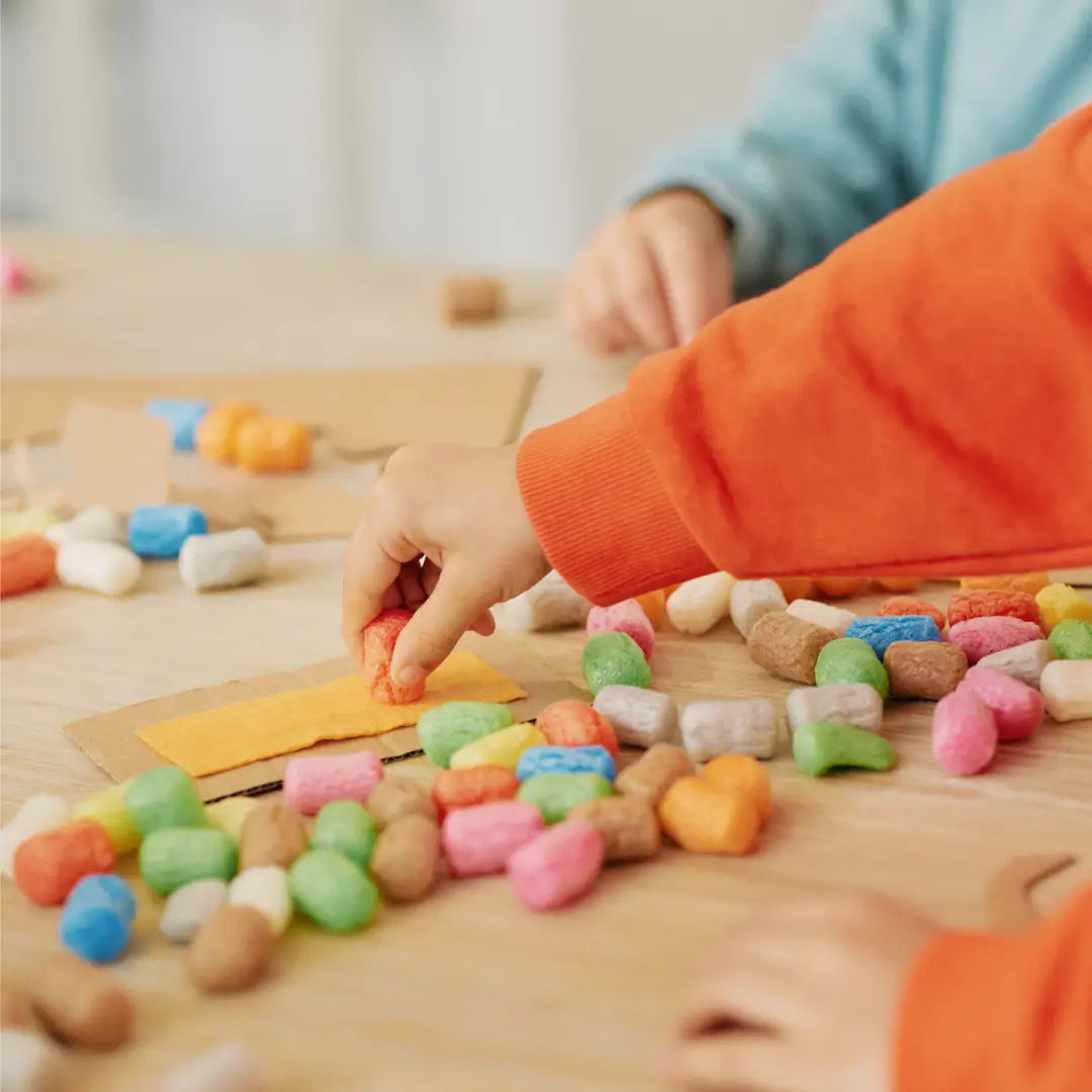 Playmais is a natural toy for crafting: By lightly moistening it with water, the natural adhesive properties of the cornstarch it contains are activated. This allows the assembled Playmais pieces to create patterns, animal figures, pirate ships, objects, or entire fantasy worlds that the children themselves create.