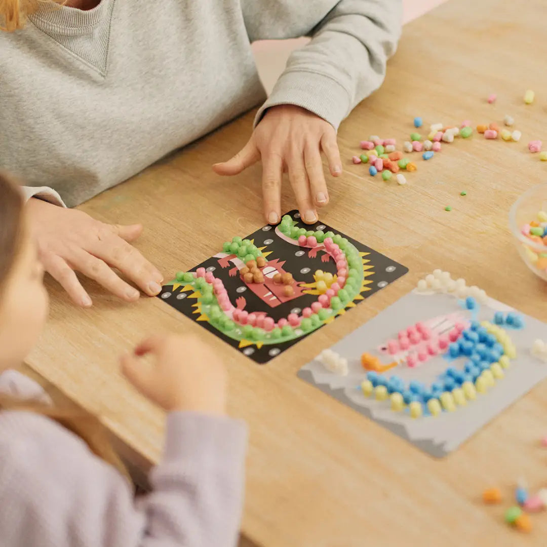 Playmais is a natural toy for crafting: By lightly moistening it with water, the natural adhesive properties of the cornstarch it contains are activated. This allows the assembled Playmais pieces to create patterns, animal figures, pirate ships, objects, or entire fantasy worlds that the children themselves create.