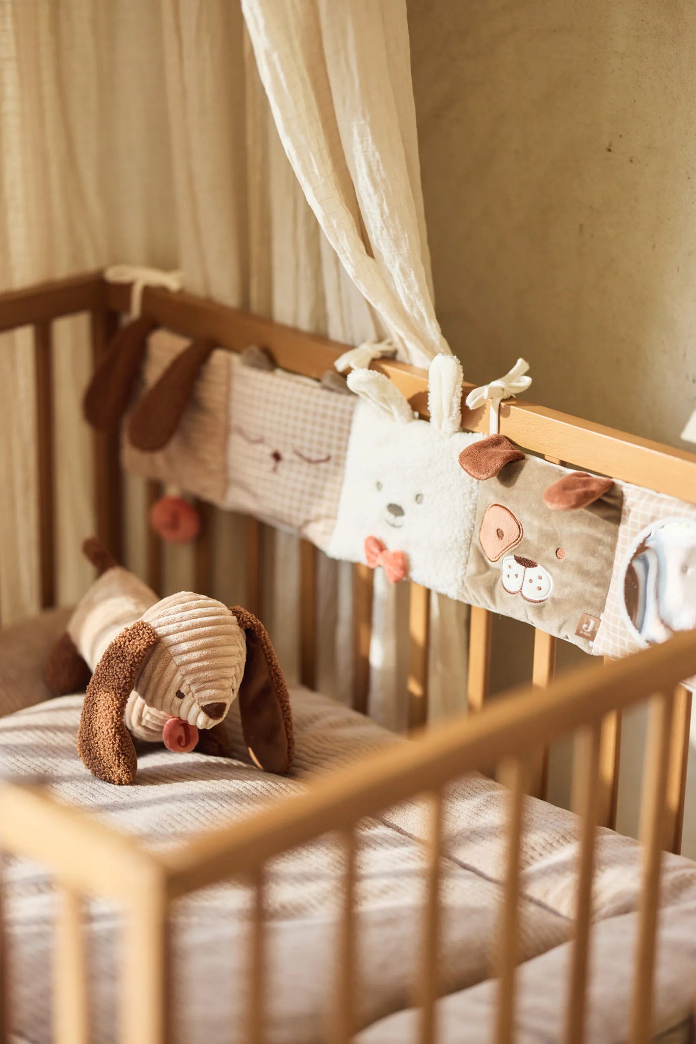 This Playpen activity book offers a variety of play options: mirrors to spark curiosity, bells that make cheerful sounds, crinkly textures to explore, and soft materials to cuddle. With cords at the top, you can easily secure it to the playpen. Isn't this the perfect (newborn) gift?