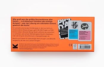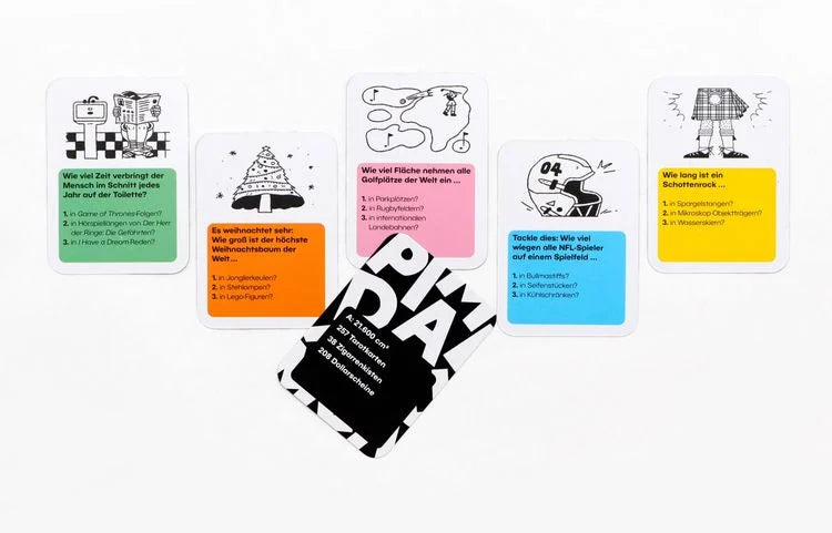 Pi mal Daumen is a quick-to-learn family game that doesn't rely on traditional trivia questions. With 900 questions on 300 cards, everyone will have a blast trying to estimate how heavy Michelangelo's David is in sea lions, or how long a kilt is in asparagus spears.